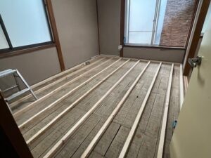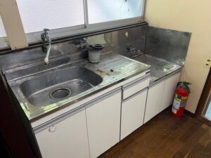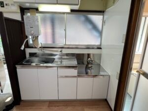 オーナー様のご希望は、畳を撤去してクッションフロアに、壁は真壁でクロス貼替、キッチンや風呂・トイレ等設備品は新しいものを入れてほしいとの事でご依頼をいただきました。